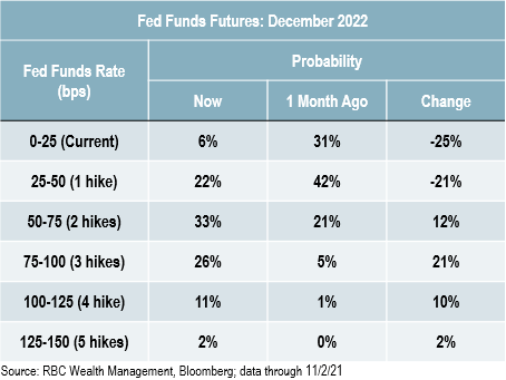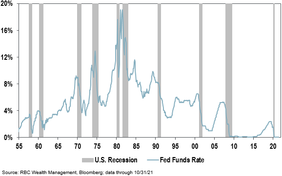 The U.S. Federal Reserve (Fed) has formally announced its plans for tapering the pace of its QE program – ending sometime around mid-2022. Investor attention may now start to shift towards discussions about the timing of next rate hike cycle. Considerations about rate hikes would be a natural evolution of the broader discussion around the Fed’s guidance on gradually dialing back their significant monetary stimulus support that has fueled a swift recovery for the U.S. economy from last year’s pandemic-induced recession, which has coincided with a strong burst of inflation.