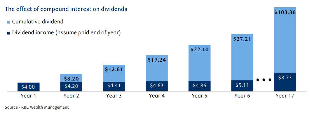 A shareholder could theoretically regain the entire cost for this stock after a 17-year holding period and continue to own the underlying stock. In the above example, I also assumed the share price of $100 remained unchanged. In reality, companies that can consistently grow their dividends are also likely to experience positive share price appreciation as well. In addition, Canadian dividends received in non-registered accounts come with the added benefit of lower taxes.