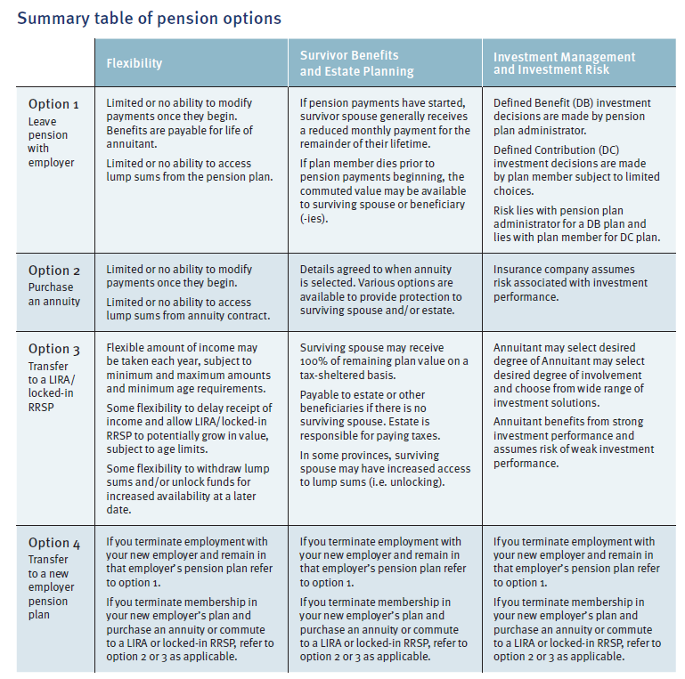 If you have been a member of a pension plan for many years, the benefits that you have earned in the plan may be the largest source of income you will receive in retirement. When you leave your employer, your pension plan administrator will send you a written summary outlining your company pension plan options. You will be required to select one of the options by a specific deadline. Sometimes you may not have very much time to make your decision. Generally if you do not act before the deadline, the administrator may consider that you have chosen one of the options by default, which may or may not be the best option for you. Your pension plan options, including when you will receive the money, how much money you will receive and how your spouse and other dependents may be affected, will all depend on your specific pension plan as well as the applicable legislation that governs the benefits you have accumulated.