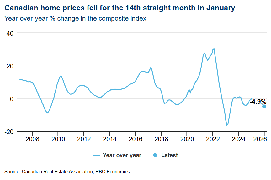 Sales of existing homes fell 5.8% month-on-month in January as winter storms and frigid weather played a role in lower sales activity. Benchmark prices fell 0.9% in January to $665,200—the lowest level in almost five years—and are now down 4.9% on a year-on-year basis, according to the Canadian Real Estate Association. There was also a burst of new supply in Montreal, Quebec City, Calgary, Greater Vancouver and Victoria—although areas in Central and Southwestern Ontario posted declines.